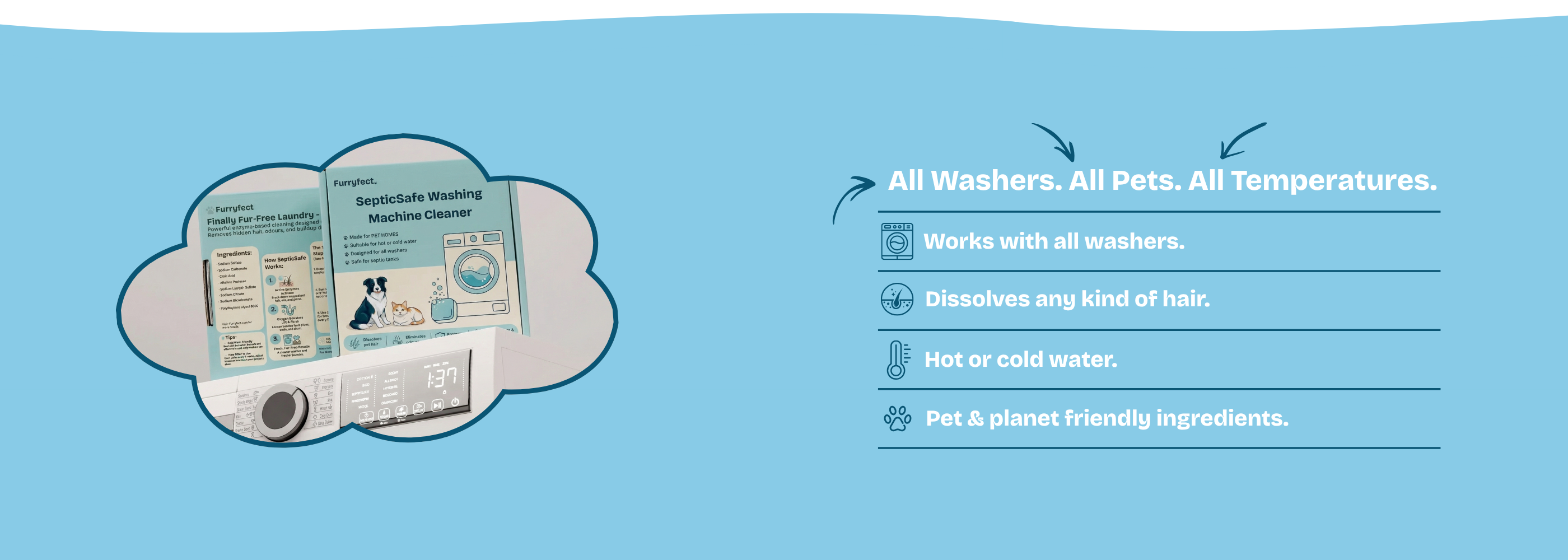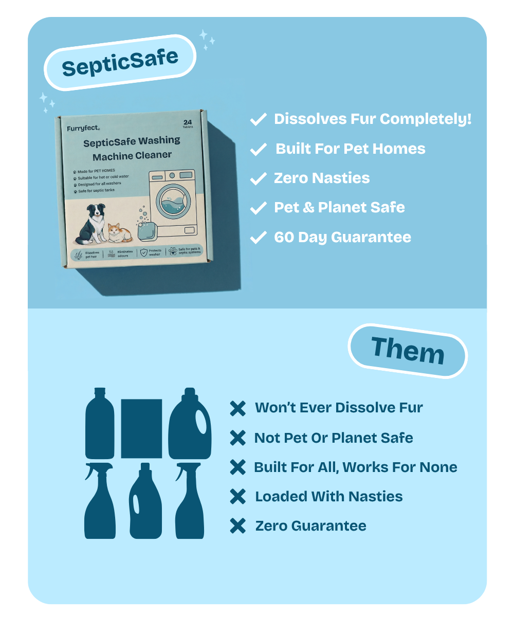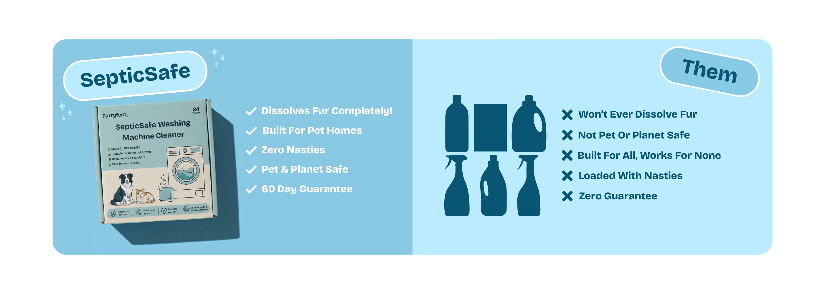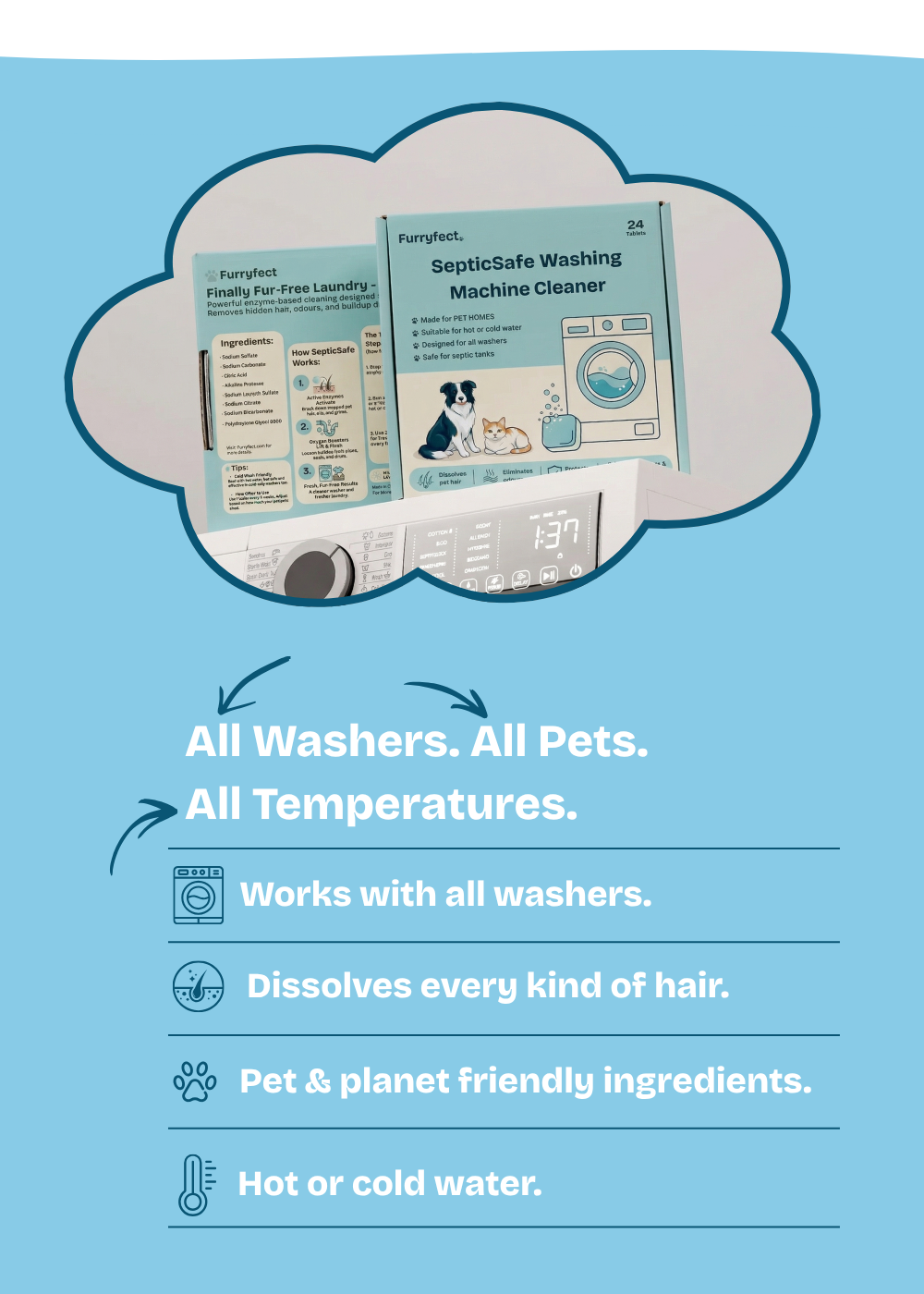 SepticSafe is different. It's the first washer cleaner made for dog mums. With an enzyme-oxygen formula thats designed to break down the pet hair and oils trapped in your drum, gasket, and filter. The exact buildup that makes your laundry still smell like wet dog and come out covered in fur!